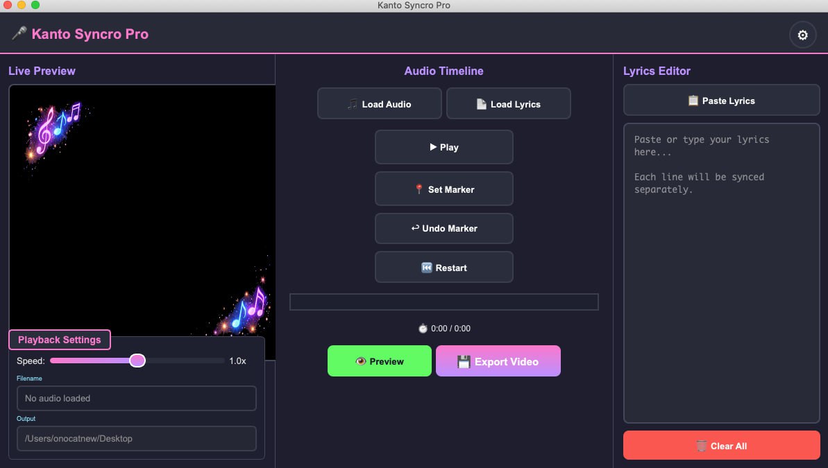 KANTO SYNCRO PER MAC è una nuovissima applicazione che ti consentirà di creare video karaoke (di formato .MP4, .MPG o .AVI), sincronizzando in modo intuitivo il testo della canzone sulla traccia audio originale (di formato mp3).