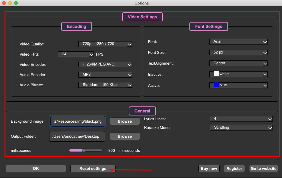 GENERAL: in tale sezione potrai scegliere l’immagine di sfondo, modalità di scorrimento del testo (karaoke mode), il numero di righe del testo karaoke in caso di karaoke statico, la cartella predefinita di output e i “millisecondi” di anticipo da considerare per l’evidenziazione delle parole sincronizzate.