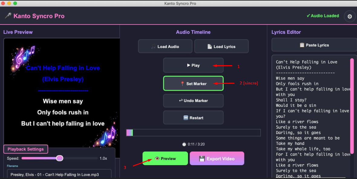 A questo punto verrà riprodotta la traccia audio e dovrai semplicemente cliccare sul pulsante SET MARKER (2) su ogni parola per sincronizzarla (nel momento opportuno ovviamente). Kanto Syncro per aiutarti evidenzierà in blu la parola nel momento in cui clicchi su SET (come si vede dall’immagine qui sotto):